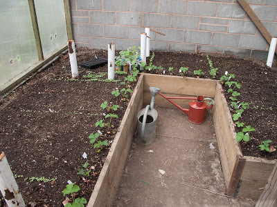 Two of my tomato plants have more than doubled in size, so I've taken the plunge and planted them in ring culture in the small greenhouse ... I'm edging the beds in strawberries :)